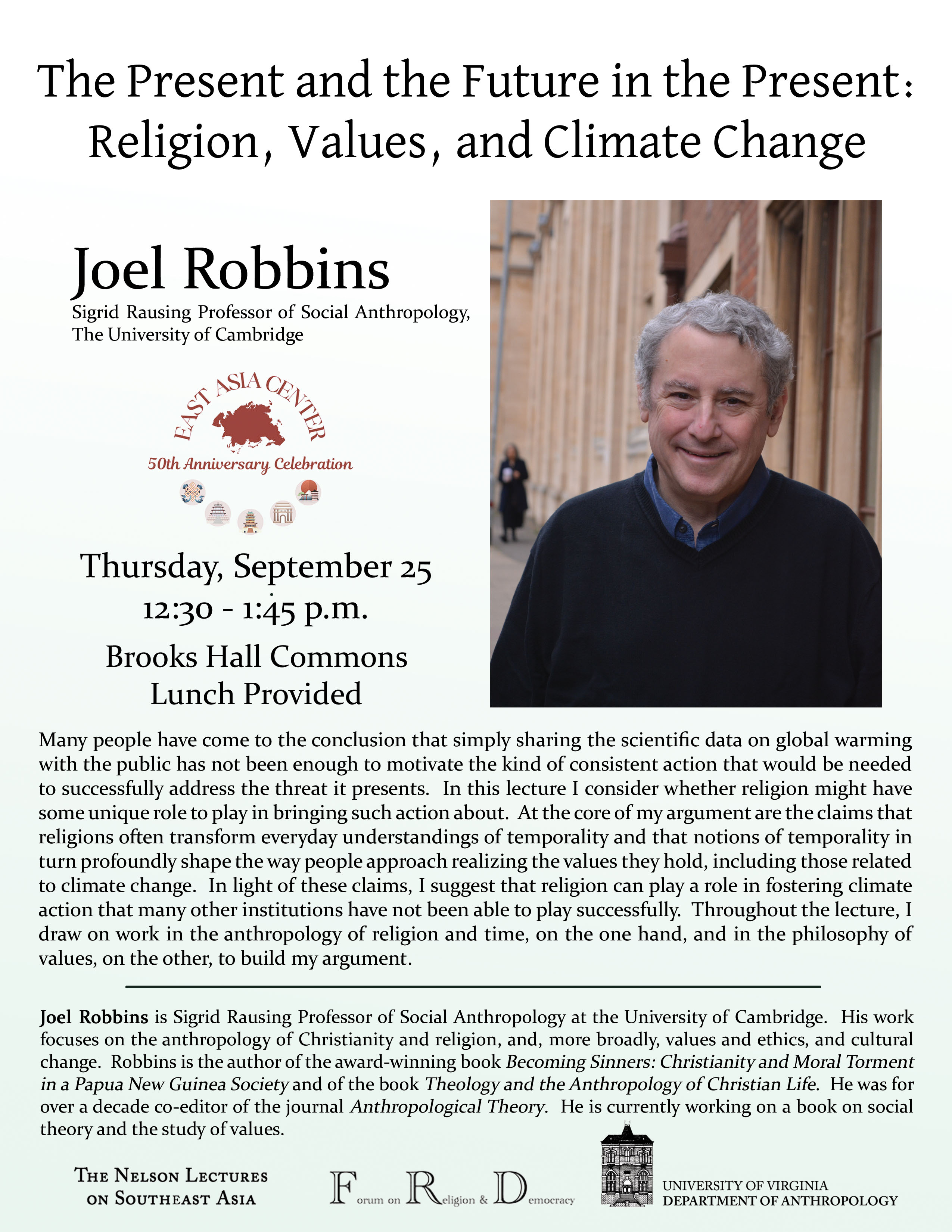 As part of the University of Virginia East Asia Center's 50th Anniversary celebration, we are thrilled to be hosting our prestigious alumnus Joel Robbins, Sigrid Rausing Professor of Social Anthropology at the University of Cambridge, for a Nelson Lecture on Southeast Asia, entitled "The Present and the Future in the Present: Religion, Values, and Climate Change."